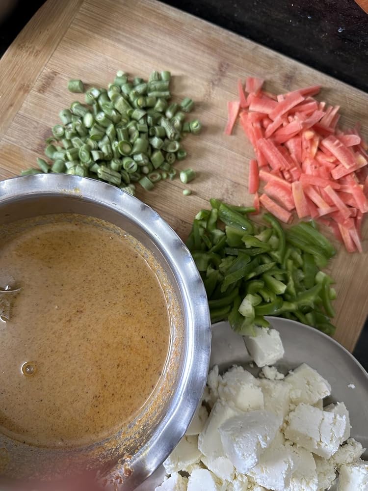 4. Cook Veggies and Gravy: Chop 150g vegetables (peas, carrots, cauliflower, capsicum) and 100g paneer. Stir-fry veggies in oil until half-cooked. Add the gravy, cook until thick, then mix in the paneer. Add salt to taste.