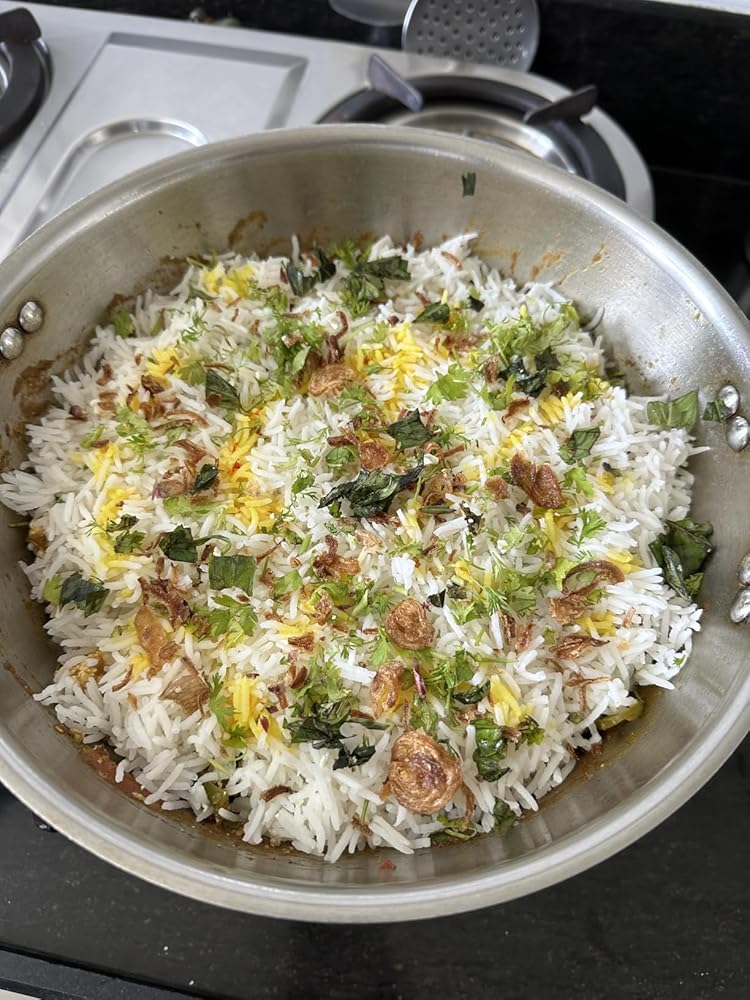 Chef Hasti’s Tip: For a smoky flavour, heat a small piece of coal until red hot. Place it in a bowl with 1 tsp ghee, let it smoke, and place the bowl inside the biryani pan for 1 minute (covered). Remove coal before serving.